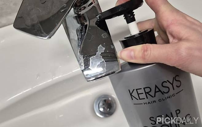 세면대 수전 주변에는 비누 잔여물이나 핸드크림, 기름기가 묻어 끈적하게 남는 경우가 많습니다. 샴푸를 헝겊에 조금 묻혀 수전 표면을 닦아주면 이런 유분 계열 오염이 깔끔하게 닦여요.