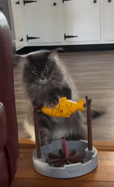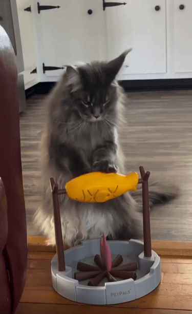 한적한 방 한켠, 작고 귀여운 모닥불 장난감 위에 조그마한 물고기 인형 하나가 매달려 있습니다. 불은 물론 가짜지만, 그 분위기만큼은 꽤 그럴싸한 캠핑 요리 현장. 그리고 그 장면의 주인공은, 진지하게 물고기를 돌리고 있는 한 마리 고양이입니다.