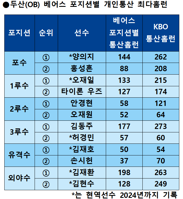 ◆베어스 프랜차이즈 포지션별 최다홈런 선수는?