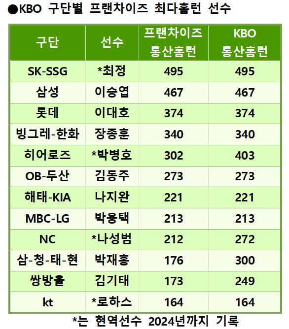 KBO 구단별 프랜차이즈 최다홈런 선수를 집계한 결과 SSG 랜더스의 최정이 개인통산 495홈런으로 전체 1위를 차지했다. 2005년 SK 와이번스에 입단해 2024년 SSG 소속으로 20년을 한 프랜차이즈에서만 뛰면서 역사를 써나가고 있다. 올 시즌 개막 후 머지않아 KBO 최초 개인통산 500홈런 돌파도 기대된다.