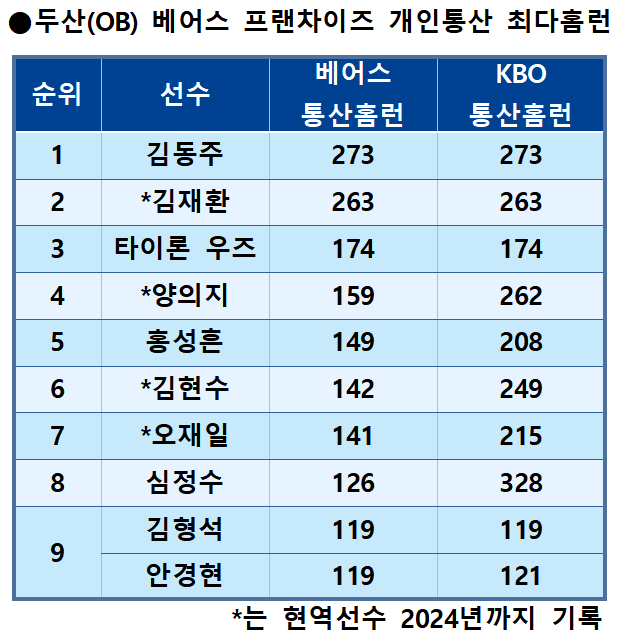 앞서 소개한 대로 두산 베어스(OB 시절 포함) 프랜차이즈 최다 홈런 타자는 아직도 ‘두목곰’ 김동주가 1위다..