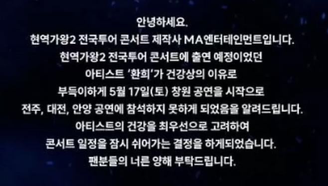환희는 최근까지 MBN 예능 <현역가왕2> 전국투어 콘서트에 참여 중이었습니다. 그러나 공연 주최 측인 MA엔터테인먼트는 “환희가 건강상의 이유로 창원, 전주, 대전, 안양 공연에 참여하지 못하게 됐다”며 일정 변경을 알렸습니다. 관계자는 “아티스트의 건강을 최우선으로 고려해 휴식 결정을 내렸다”며 “환희를 기다려온 팬들께 너른 양해를 부탁드린다”고 전했습니다.