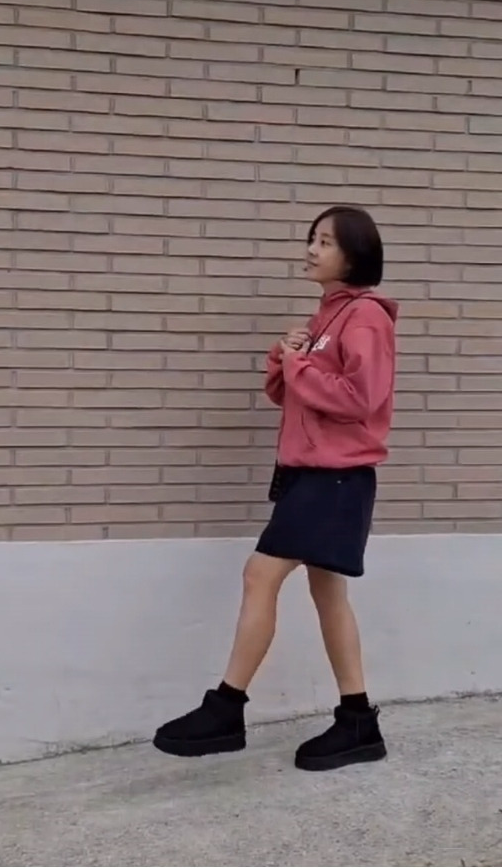 박은혜는 핑크 컬러의 후드티와 네이비 스커트 조합으로 발랄하면서도 캐주얼한 스타일을 연출했습니다.