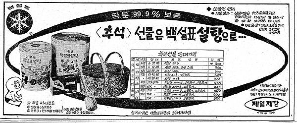 신세계백화점에서 1996년 펴낸 '광복 50주년, 추석 선물 50년'이란 자료에 따르면 1965년 최고의 인기 선물은 6kg짜리 설탕 봉지였다고 한다. 당시 가격이 780원으로, 한 개에 10원 하는 라면 50개들이 1 상자보다 비쌌으니 꽤나 귀한 제품이었는지 짐작할 수 있다.