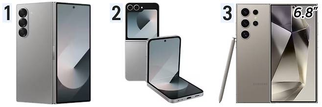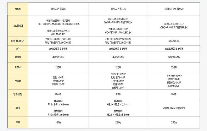 각 제품의 사양을 따져보면 단연 가장 큰 차이는 폼팩터다. S24 울트라는 폴더블폰이 아닌 일반적인 바형 디자인으로 대중적인 형태이며 폴더블 폼팩터는 호불호가 있는 형태라는 것을 참고하자. 무게는 폴드6가 239g으로 가장 무겁고, 다음은 S24 울트라(232g)와 플립6(187g) 순이다.