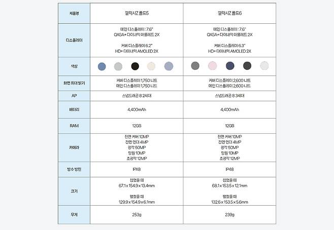 방진 기능이 추가된 것도 특징이다. 폴드6의 방수·방진 등급은 IP48로 전작에 적용된 IPX8와는 차이가 있다. IP 등급 뒤에 붙는 첫 번째 숫자는 방진, 두 번째 숫자는 방수를 뜻한다. 폴드 시리즈 중 방진 등급이 적용된 것은 이번이 처음이다.