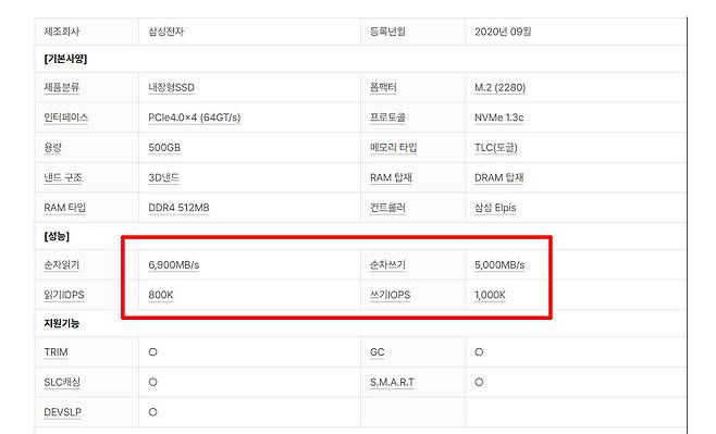알아낸 M.2 SSD의 모델명을 인터넷에서 검색해보면 지원하는 PCIe 버전과 읽기, 쓰기 속도를 알아낼 수 있다. 필자가 사용하는 M.2 SSD는 삼성 980Pro 500GB<실시간 145,000원> 모델로 PCIe 4.0에 읽기 6900MB/s, 쓰기 5,000MB/s 속도라 열이 많이 발생해 방열판 사용이 추천된다.