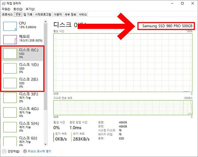하지만, 자신이 지금 사용하고 있는 M.2 SSD의 모델명과 스펙을 모르는 사람도 많다. 이럴 경우 가장 빨리 알아보는 방법은 CTRL+ALT+TAB 을 눌러 작업 관리자를 실행시킨다. 그 다음 상단의 '성능'탭을 누르면 좌측에 디바이스들이 나열되는데 여기에서 SSD를 누르면 오른쪽 창에 모델명이 나타난다.