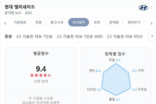 실제 차량 소유주들의 차량 평가 데이터를 취합한 네이버 마이카 오너평가에 따르면 현대차 팰리세이드 오너들이 평가한 평균 점수는 9.4점이다.