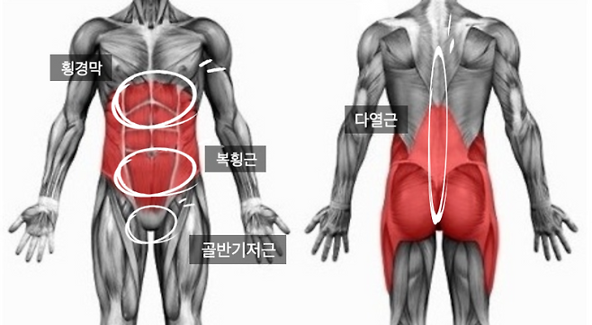 코어 근육을 강화시키는 방법도 있지만 코어를 단련시키는데 있어 가장 중요한 건 횡격막을 이용한 복식 호흡이 밑바탕이 되어 있어야 해요.