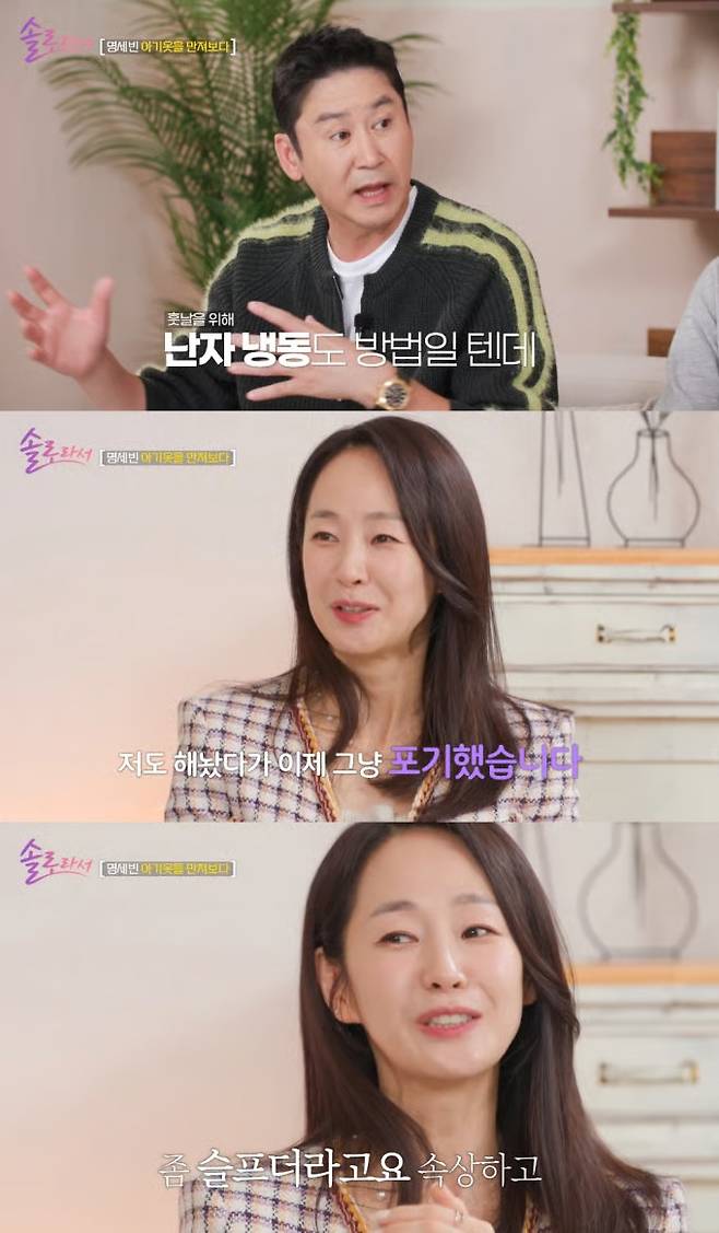 난자 냉동 연장을 포기한 이유에 대해 명세빈은 "난자만 있어서 될 게 아니라 착상도 해야 하지 않나. 앞으로의 과정들이 쉽지 않을 거 같아서 포기했다"며 "좀 슬프고 속상하더라. 그날은 기분이 이상했다"라며 "나의 삶은 이렇게 살아가야 하는 건가 보다"라고 말하고는 씁쓸하게 웃었습니다.