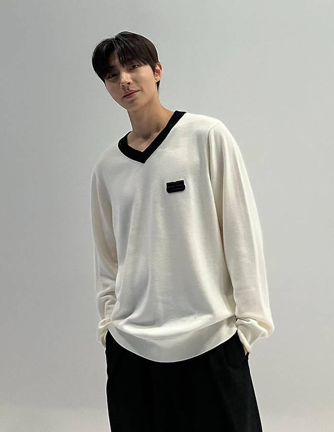 로고패치와 블랙 배색 컬러의 네크라인이 포인트 디자인이 돋보이는 컨템포러리 스타일의 울 니트 제품으로 고급스럽우면서 세련된 감각을 강조했다.