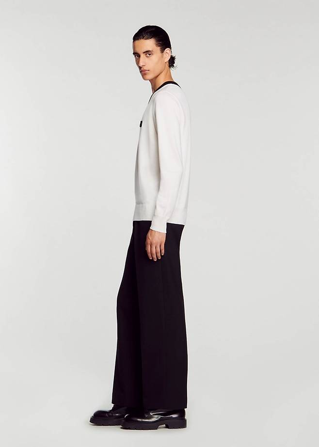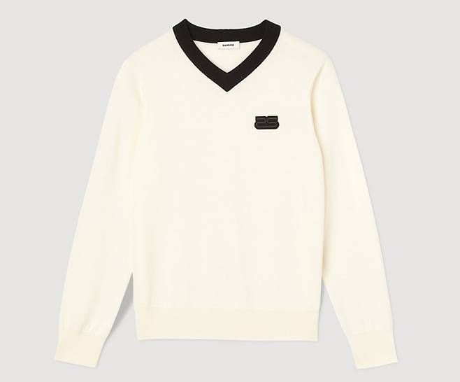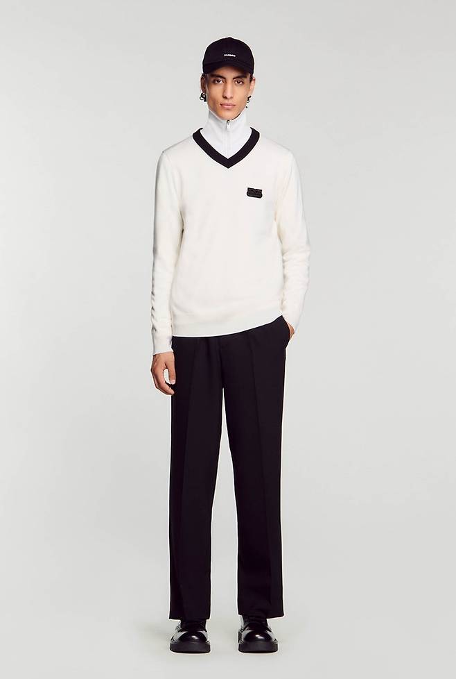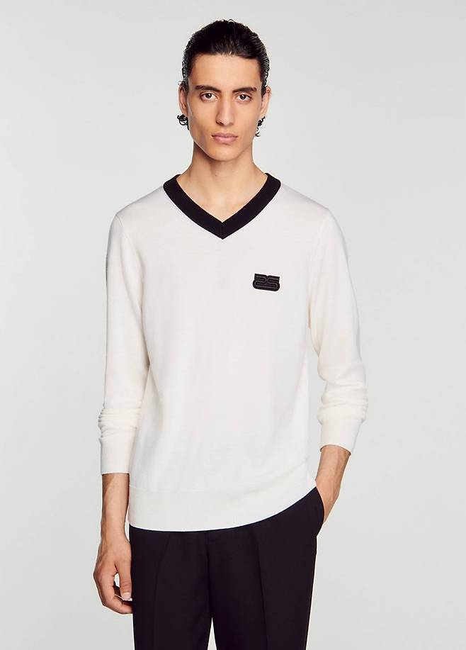 프렌치 컨템포러리 '산드로 옴므' 로고 패치 배색 네크라인의 V넥 니트룩 '인기폭발'