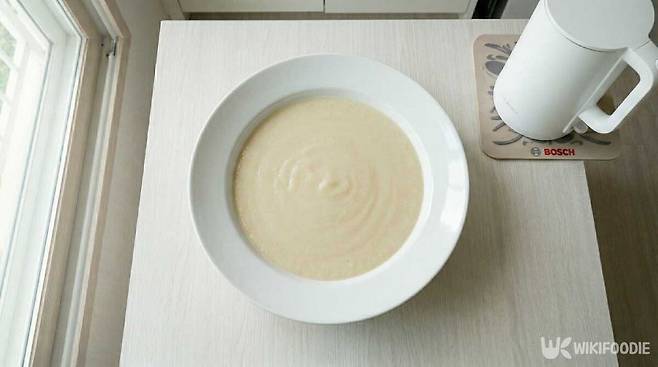 다시 냄비를 약불에 올린다. 우유 300ml를 넣고 저어가며 끓인다. 끓기 시작하면 생크림 120ml를 넣는다. 소금 1작은술로 간을 맞추고 후추를 약간 더한다. 2분 정도 더 끓이면 마무리된다.