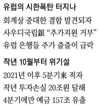 이런 상황에서 사우디 국립은행이 추가 유동성 공급을 거부하면서 크레디트스위스를 비롯한 은행주가 직격탄을 맞았다. CNBC에 따르면 이날 소시에테제네랄은 12%, BNP파리바는 11%, 도이치뱅크는 8% 주가가 급락하며 주식 거래가 일시 중단됐다.