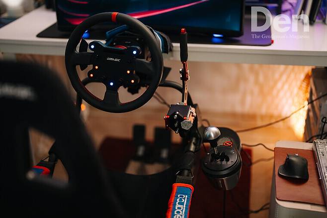 한 공간에서 유튜브 촬영과 심 레이싱 게임을 병행한다. 핵심 장비에 집중하는 방향으로 공간 활용성을 높였다.