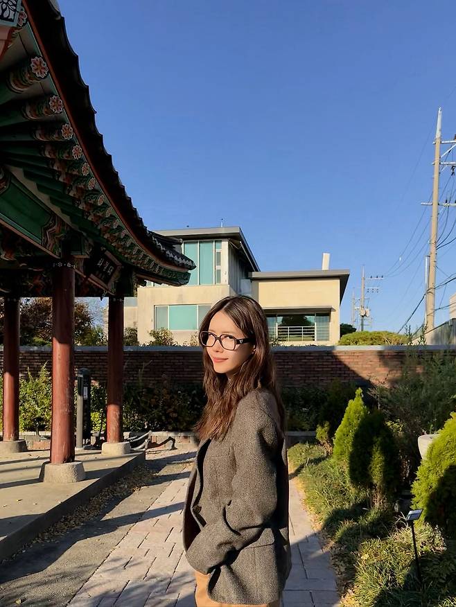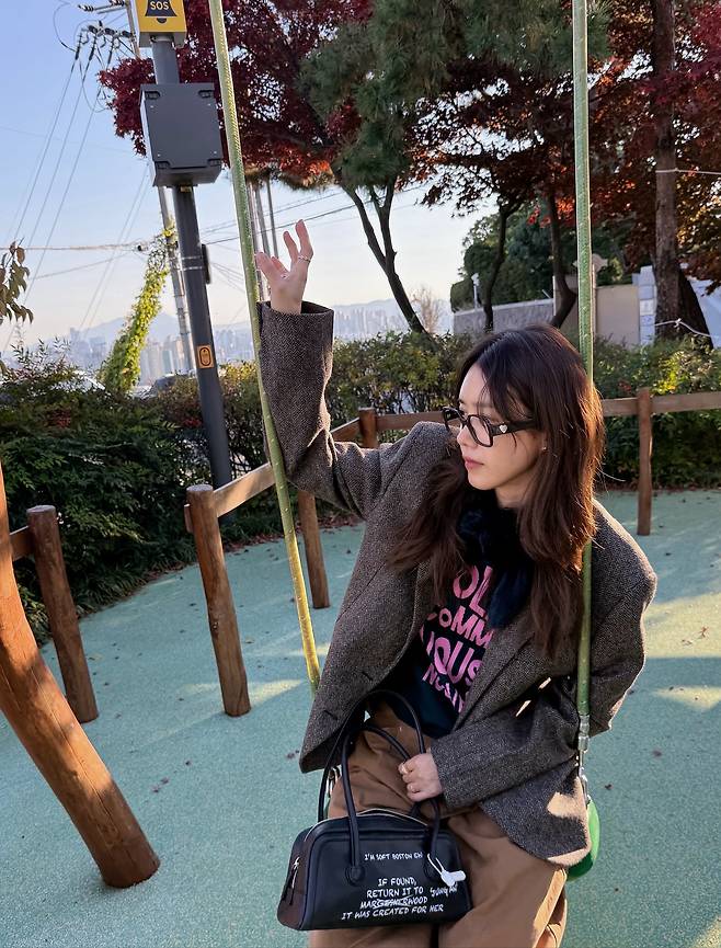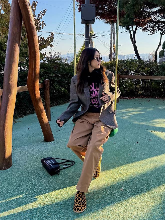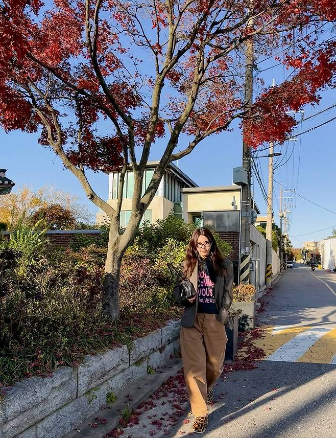 깊게 물든 단풍나무 아래에서 그녀가 선택한 스타일은 클래식한 재킷과 루즈한 와이드 팬츠의 조합으로, 편안하면서도 우아한 실루엣을 만들어내요.
