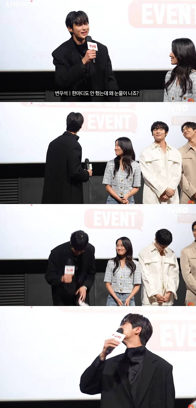 그의 눈물의 이유는 팬들의 사랑에 대한 고마운 마음 때문이다. 감정을 주체하지 못한 채 울먹이는 모습을 보이더니, 결국 눈물을 흘린 변우석. "안운다"라는 말과 다르게 눈에는 눈물이 그렁그렁 맺혀있는 모습이다.
