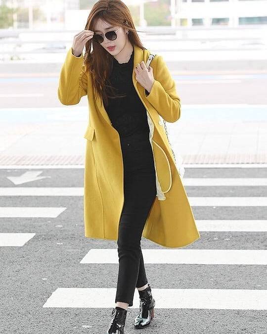 두 번째 사진에서 유인나는 밝은 옐로우 코트를 활용해 세련된 공항 패션을 연출했다. 안쪽에는 블랙 컬러의 이너웨어와 슬림 핏 팬츠를 매치해 깔끔하면서도 모던한 분위기를 완성했다. 여기에 광택감 있는 블랙 앵클 부츠를 더해 포인트를 주었으며, 화이트 백으로 전체적인 룩에 경쾌함을 더했다.