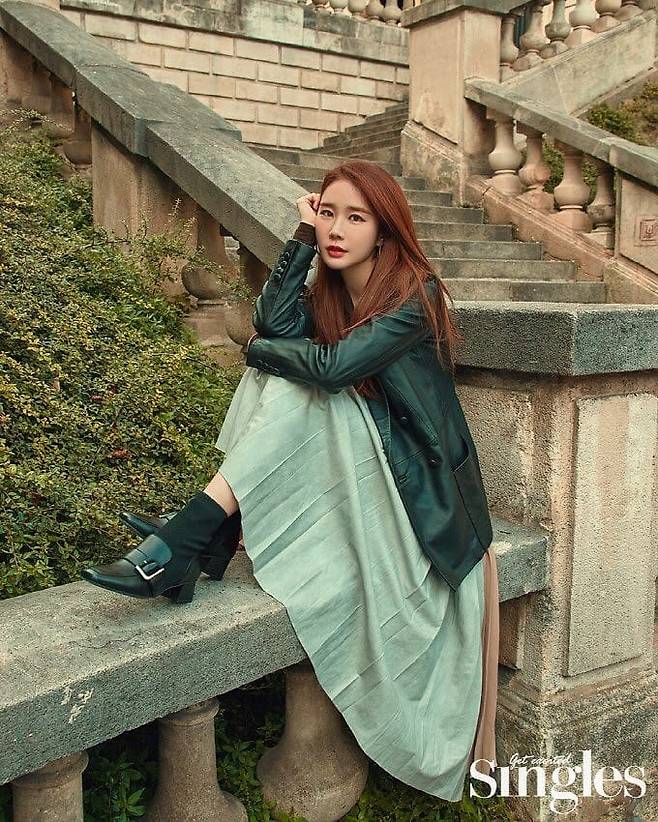 세 번째 사진에서는 그린 컬러의 레더 재킷과 플리츠 디테일이 돋보이는 롱 스커트를 조합해 독특하면서도 감각적인 스타일링을 선보였다. 블랙 앵클 부츠로 마무리하며 시크한 무드를 유지했으며, 계단 위에 앉아 있는 포즈가 자연스러운 분위기를 자아낸다.