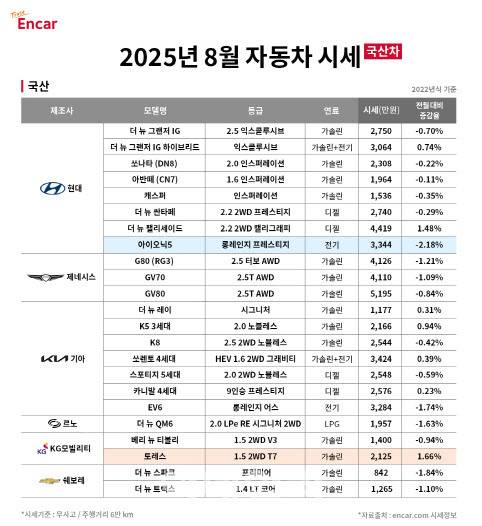 반면, 프리미엄 국산 SUV와 소형차, 전기차 일부 모델은 평균보다 높은 낙폭을 보이며 구매자 입장에서 가격 메리트가 높아진 시점이기도 하다. 예컨대 제네시스 GV70 2.5T AWD는 1.09%, GV80 2.5T AWD는 0.84% 하락했다. 소형차에서는 쉐보레 더 뉴 스파크가 1.84% 떨어졌고, 전기차 부문에서는 아이오닉5 롱레인지 프레스티지가 2.18%, 기아 EV6 롱레인지 어스가 1.74% 하락했다.