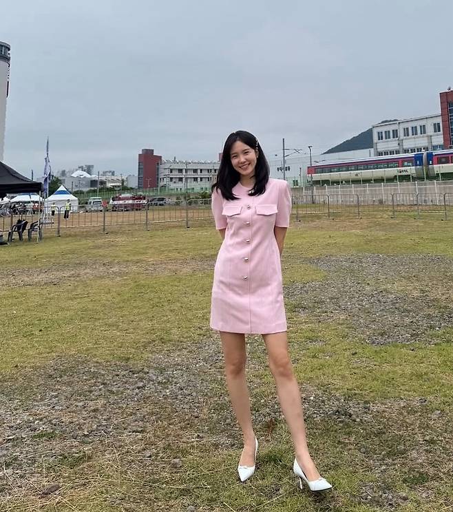 라이트 핑크 컬러의 버튼 원피스를 착용해 발랄하면서도 여성스러운 분위기를 강조했습니다.