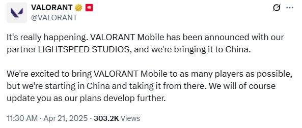 라이엇 게임즈는 오늘(21일), 발로란트 공식 SNS를 통해 발로란트 모바일의 개발사와 향후 소식에 대해 언급했다. 발로란트 모바일은 텐센트 산하 라이트스피드 스튜디오와 공동으로 개발하며, 중국에서 먼저 선보일 예정이다. 라이엇 게임즈는 그외 자세한 소식은 구체화되는 대로 소식을 전할 것이라고 덧붙였다.