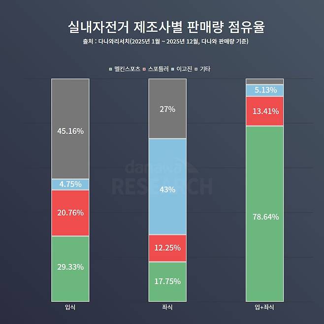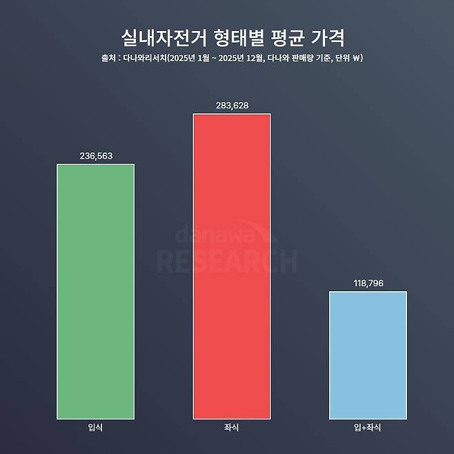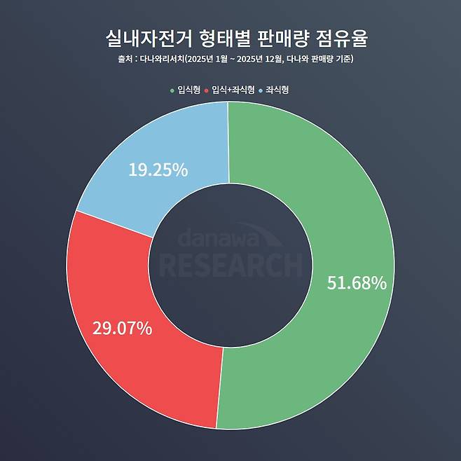 실내 자전거는 운동 자세에 따라 크게 입식과 좌식, 그리고 두 기능을 합친 겸용 제품으로 구분된다. 다나와 리서치 데이터에 따르면 지난 1년간 입식 자전거가 51.68%의 점유율로 과반을 차지했다. 이어 입, 좌식 겸용 제품이 29.07%, 좌식 제품이 19.25% 판매량 점유율을 기록했다.