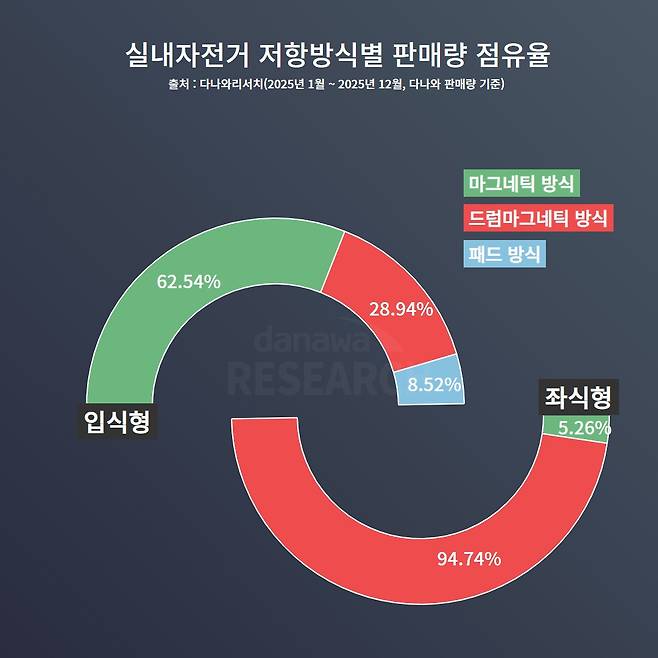 운동 효과를 결정짓는 저항 방식에서도 유형별 차이가 나타났다. 입식 자전거는 마그네틱 방식이 62.54%로 주를 이뤘으며, 28.94%를 보인 드럼 마그네틱 방식과 8.52%의 패드 방식이 뒤를 이었다. 반면 좌식 자전거는 드럼 마그네틱 방식이 94.74%로 압도적인 비중을 차지한 모습이다.
