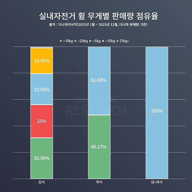 반면 좌식 실내 자전거는 5kg대 51.83%, 10kg대 48.17%로 양분되는 양상이다. 이는 체중을 등받이에 분산하고 무릎과 허리 부담을 최소화하며 장시간 운동하는 좌식 특성상, 무거운 휠보다는 가벼운 휠을 선호하는 경향이 반영된 결과다. 가벼운 운동을 위해서는 휠 무게가 무거워서는 안되기 때문이다.