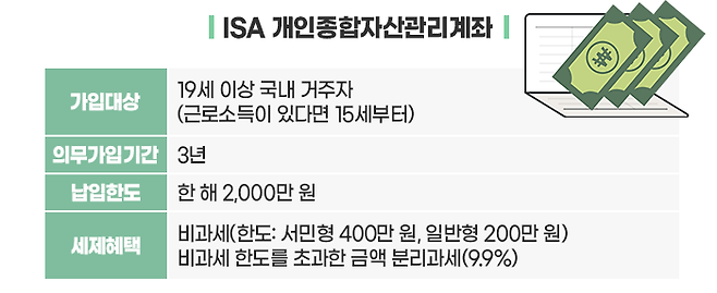 ISA는 개인종합자산관리계좌로 19세 이상 국내 거주자라면 소득과 무관하게 누구나 가입할 수 있습니다. 근로소득이 있으면 15세부터 가입할 수 있습니다. 다만 직전 3개년 중 1회 이상 금융소득 종합과세 대상자는 ISA에 가입할 수 없습니다.