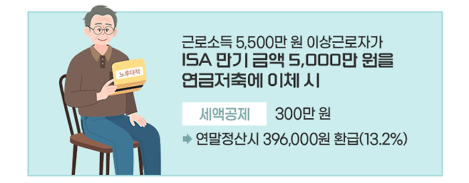 이렇게 ISA 만기 금액을 IRP와 연금저축으로 이체하면 이체한 금액의 10%(한도 300만 원)를 추가로 세액공제 받을 수 있습니다.