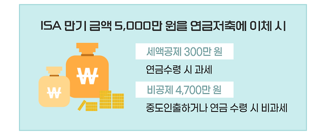 따라서 ISA 만기 금액 5,000만 원을 연금저축 또는 IRP에 이체하면, 300만 원은 세액공제 받고 저축한 금액, 나머지 4,700만 원은 세액공제 받지 않고 저축한 금액으로 분류합니다. 이렇게 세액공제 받지 않고 저축한 금액은 중도인출하거나 연금으로 수령할 때 과세하지 않습니다.