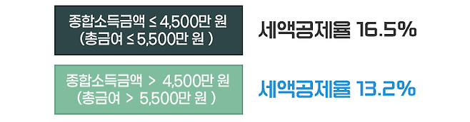 가입자의 종합소득이 4,500만 원(근로소득만 있는 경우 총급여 5,500만원) 이하면 16.5%, 이보다 소득이 많으면 13.2%의 세액공제율이 적용됩니다.