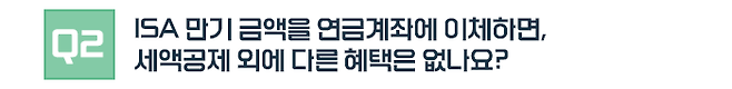 그리고 의무가입기간이 지나서 중도해지를 하거나 만기가 도래해서 수령한 금액은 연금계좌(연금저축, IRP)로 전부 또는 일부를 이체할 수 있습니다. 본래 연금계좌에는 한 해에 1,800만 원까지 저축할 수 있지만, 이와 별도로 ISA 만기 자금을 이체할 수 있습니다.