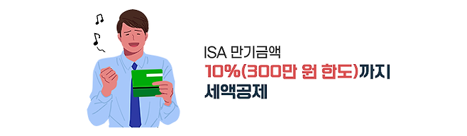 ISA에 발생한 이자와 배당소득은 손익을 통산한 다음 일부는 비과세(한도: 서민형 400만 원, 일반형 200만 원)하고, 비과세 한도를 초과한 금액은 다른 소득과 합산하지 않고 9.9%의 세율로 분리과세 합니다.