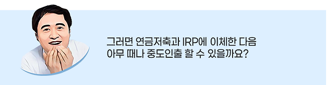 연금저축 가입자는 적립금은 별다른 제약 없이 아무 때나 중도인출 할 수 있지만, IRP 가입자는 법에서 정한 사유에 해당하는 경우에만 중도인출 할 수 있습니다.