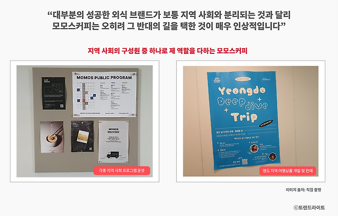 이러한 지역과의 연결은 모모스커피 매장 곳곳에서 드러납니다. 예를 들어, <시네마틱 나잇> 같은 문화 행사를 통해 지역 사회와 소통하고, 러닝이나 요가 프로그램을 운영하여 지역 주민들이 함께할 수 있는 경험을 제공하고 있습니다. 또한, 관광객을 대상으로 로컬 가이드와 함께하는 여행 프로그램을 판매하며, 단순히 커피 브랜드로서의 역할을 넘어 지역 사회의 구성원으로 자리 잡고 있기도 하고요. 대개 성공한 외식 브랜드는 지역 사회와 분리되는 경향이 있습니다. 하지만 모모스커피는 오히려 그 반대의 길을 선택하여 함께 성장하고자 하는 모습을 보이면서 더욱 특별한 브랜드로 거듭나고 있었습니다.