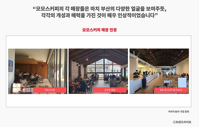 흔히 어떤 브랜드가 지점을 내면, 본점과 동일한 퀄리티의 맛과 경험을 제공하는데 집중합니다. 어디서나 일관된 커피와 공간을 경험할 수 있는 스타벅스가 대표적인 예죠. 하지만 모모스커피가 추구하는 완성도 높은 매장의 개념은 다릅니다. '커피를 마신다'는 행위를 넘어, 커피 자체를 하나의 콘텐츠로 즐기게 하며, 각 매장은 부산이라는 도시의 다양한 측면을 다각도로 바라볼 수 있는 창구 역할을 하고 있습니다.