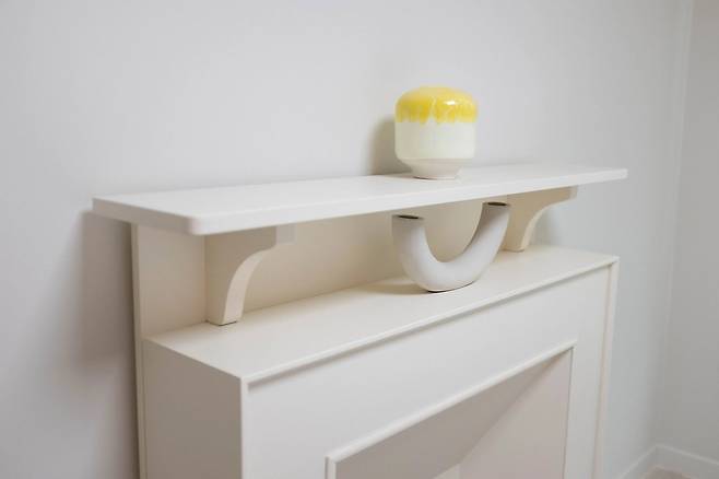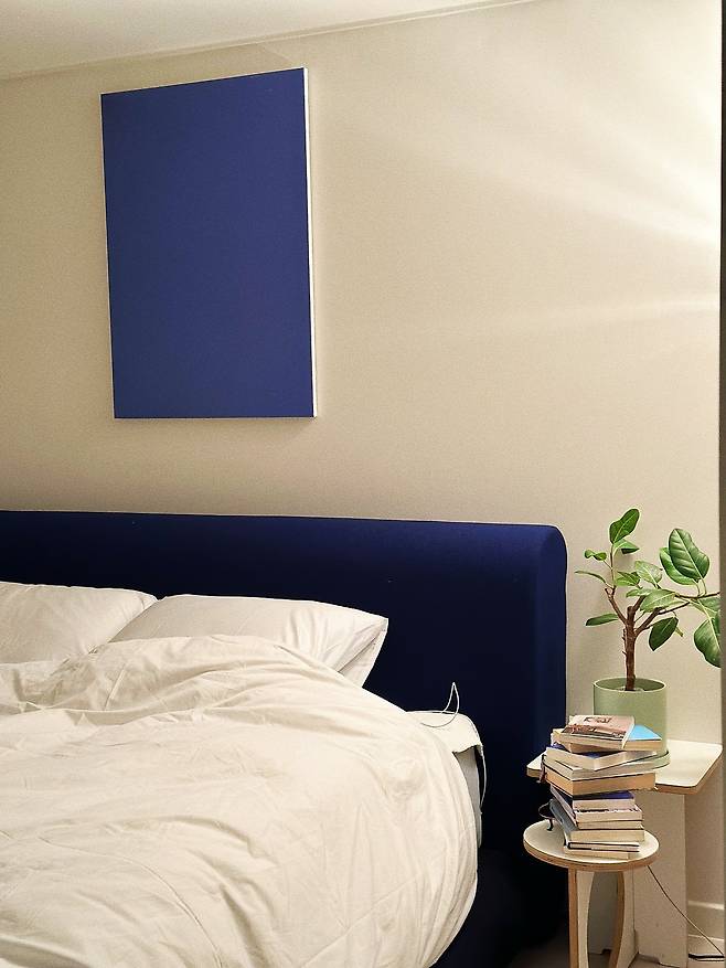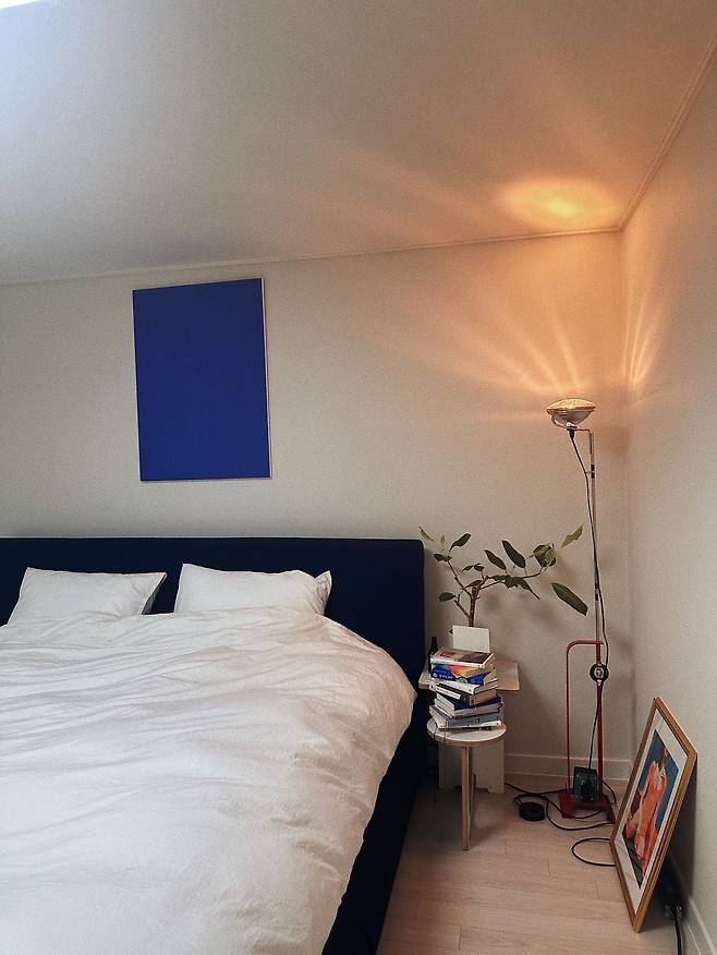 침실의 한편은 벽난로 오브제와 그림 그리고 조명이 차지하고 있는데요. 벽난로 오브제는 제가 자취할 때부터 사용하던 것을 도자기까지 그대로 가져와 사용하고 있어요. 침대 머리 맡에는 파리 여행 당시 갔던 퐁피두 박물관에서 보고 반한 이브 클라인의 그림을 걸어두었고요. 조명 옆에는 친한 친구가 선물해 준 액자를 내려놓았어요. 모두 이전 집에서 쓰던 그대로예요.