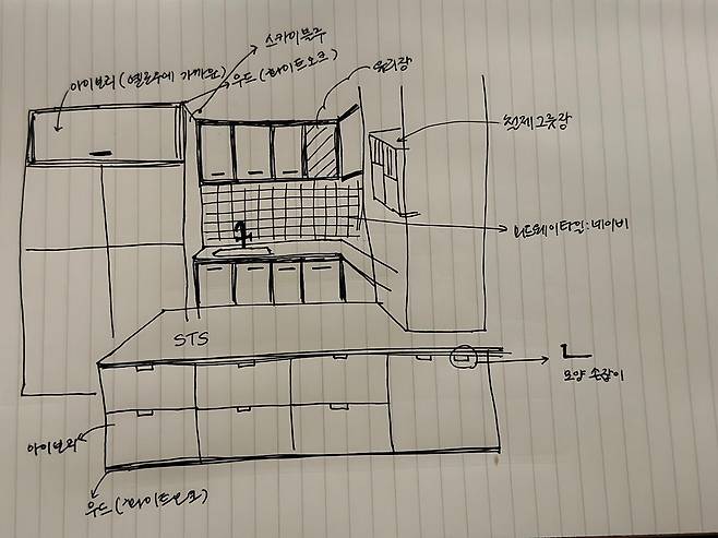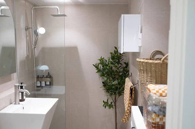 다른 곳에 제 의견이 많이 반영된 터라 남편의 의견을 무조건 존중하되, 욕실 거울 수납장은 제작하지 않았어요. 개인적으로 툭 튀어나오는 수납장이 싫기도 했지만, 거울을 자주 만지면서 묻는 손 때들이 너무 신경 쓰였거든요. 남편한테 말했죠. "혹시, 네가 다 닦을 거니? 그럼 하자." 그 덕에 수납장은 결국 뒤편에 따로 제작해서 달게 되었죠.