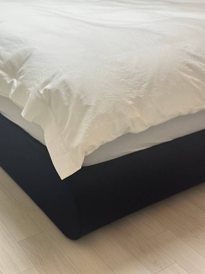 하지만 전 저희 집 침실 분위기의 일등공신은 침구라고 생각해요. 바닥, 바닥 위에 올려진 침대 프레임의 색깔과 은은하게 빛나는 침구의 조화가 분위기를 만든다고 생각하거든요. 보세요, 여러분. 촤르르하고 얼마나 좋나요?