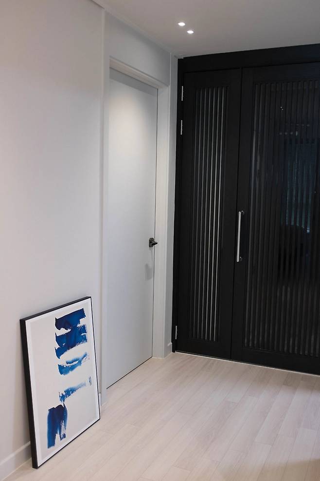 중문의 느낌을 살리기 위해 그림의 배치에도 많은 신경을 써주었어요. 검은색 중문과 톤이 맞을 수 있도록 이우환 작가의 ‘바람으로부터’를 두었답니다.