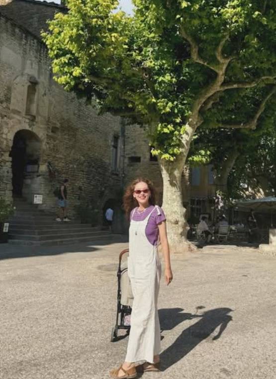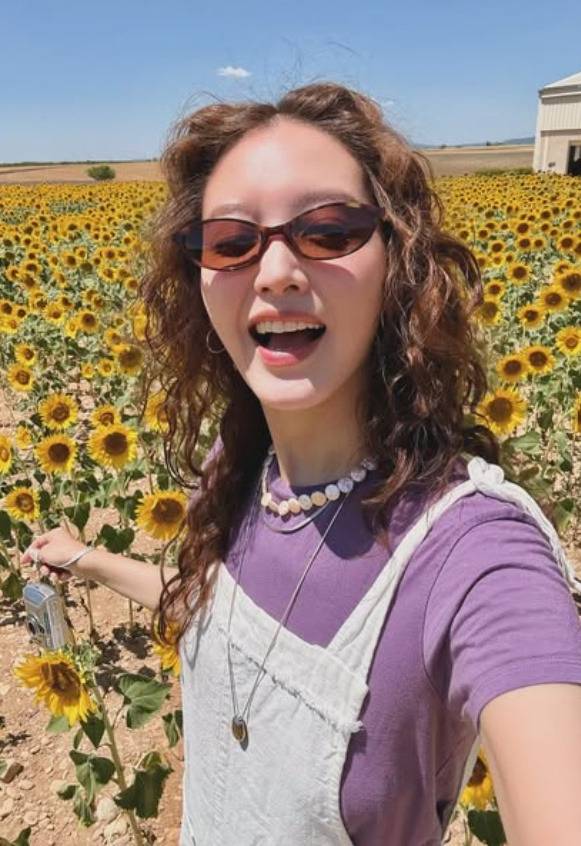 • 퍼플 티셔츠 + 화이트 오버롤 원피스: 보헤미안 무드에 귀여운 빈티지 감성까지 더한 코디. 해바라기 밭에서의 환한 미소가 영화 같은 장면을 만들어냈습니다.