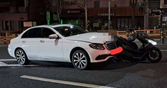목격자가 공개한 사진에는 가해자 A씨가 몰던 흰색 벤츠 차량에 오토바이 후미가 박혀 있는 모습이 담겼다. 도로 위에 피해자의 혈흔이 남아 있는 모습과 벤츠 운전자로 추정되는 여성이 길가에서 강아지를 안고 쪼그려 앉아 현장을 지켜보는 장면도 포착됐다.