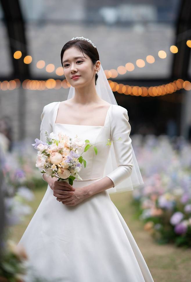 실크 소재의 미니멀한 웨딩드레스, 장식 없는 생화 부케, 그리고 로우 번 헤어스타일은 장나라 특유의 깨끗하고 우아한 분위기를 그대로 살려냈다.