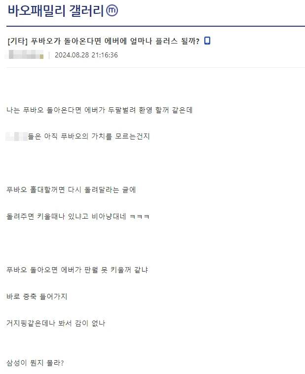 글을 작성한 팬은 "푸바오가 돌아오면 에버랜드 판다월드가 못 키울 것 같냐. 바로 증축 들어갈 것이다. 선수핑 같은 곳만 봐서 감이 없나"라고 말하며 "삼성이 뭔지 모르나보다"라고 반박했습니다.