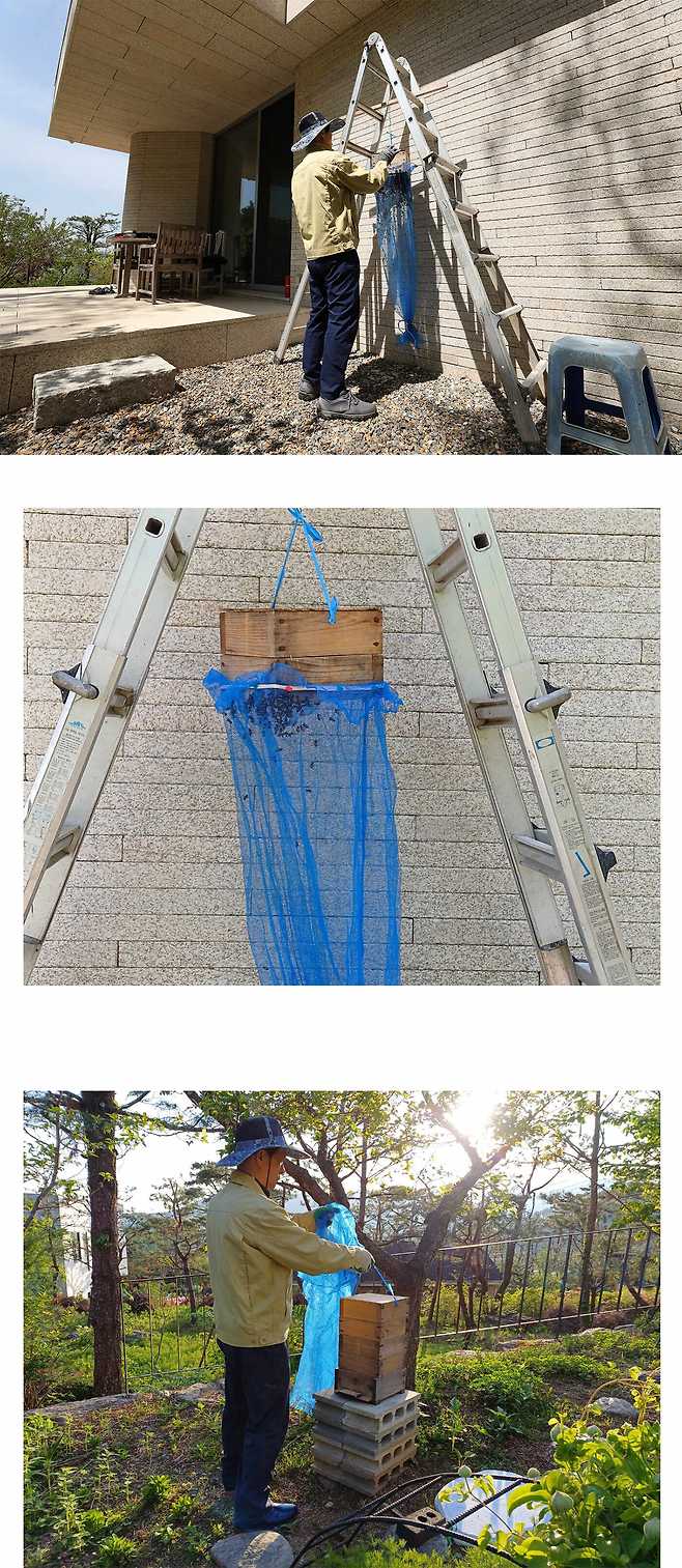 채집망에 있는 벌들을 벌통에 연결했을 때