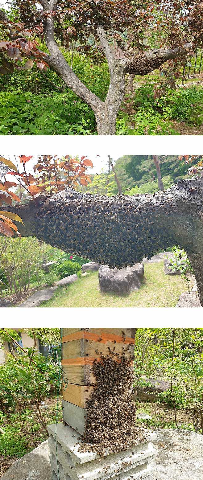 이사 나가는 청년벌들은 날아 오르고 남아 있을 벌들은 벌통 외벽에 붙는다.