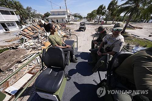 Law enforcement officers from the Florida Fish Wildlife and Conservation Commission drive past destruction in a high water capable swamp buggy, in the aftermath of Hurricane Helene, in Cedar Key, Fla., Friday, Sept. 27, 2024. (AP Photo/Gerald Herbert)